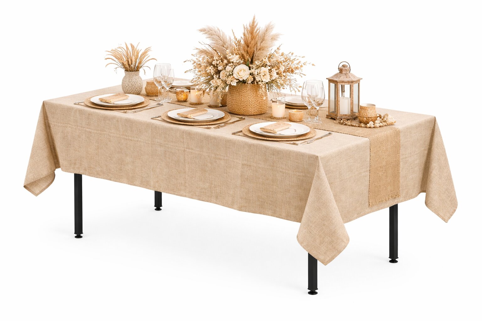 Az asztalterítő 100% poliészterből készül, ami nagy tartósságot és funkcionalitást biztosít. Az anyag gyűrődésálló, könnyen tisztítható és gyorsan szárad. Ugyanakkor a szövet speciális szerkezete tökéletesen utánozza a len természetes megjelenését, így a termék ötvözi az esztétikai és a praktikus tulajdonságokat. Ez a megoldás azoknak szól, akik értékelik a természetes szövetek szépségét, de kényelmes használatot várnak el.
