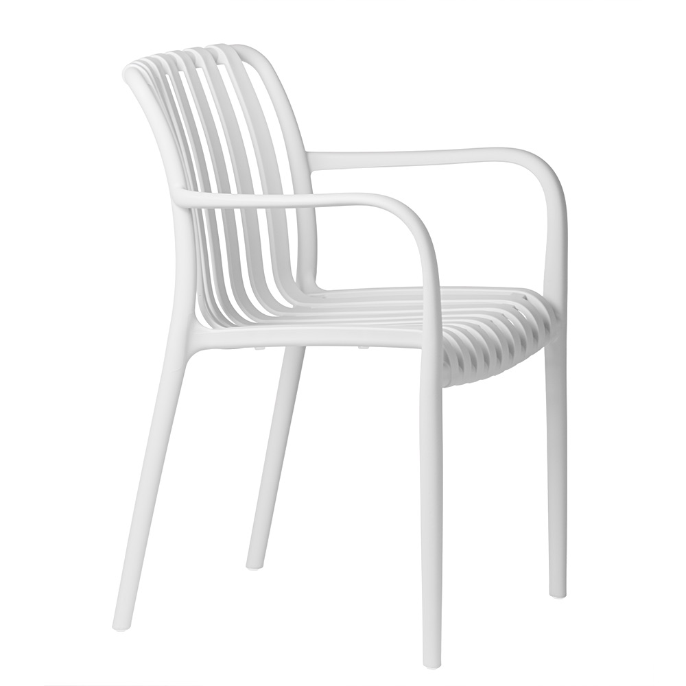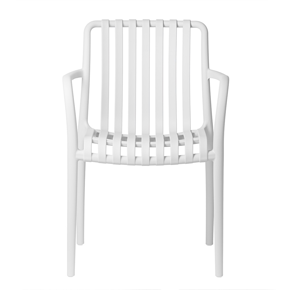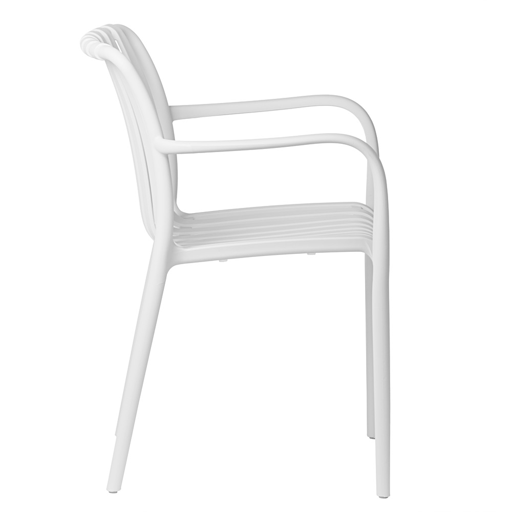 Krzesło Aura w kolorze białym to nowoczesne krzesło ogrodowe z podłokietnikami, które wyróżnia się prostą formą i uniwersalnym charakterem. Jasna, neutralna kolorystyka optycznie rozjaśnia przestrzeń i sprawia, że mebel doskonale prezentuje się na tarasie, balkonie oraz w ogrodzie. Smukłe, pionowe listwy oparcia nadają konstrukcji lekkości wizualnej, a spójna linia podłokietników podkreśla minimalistyczny design