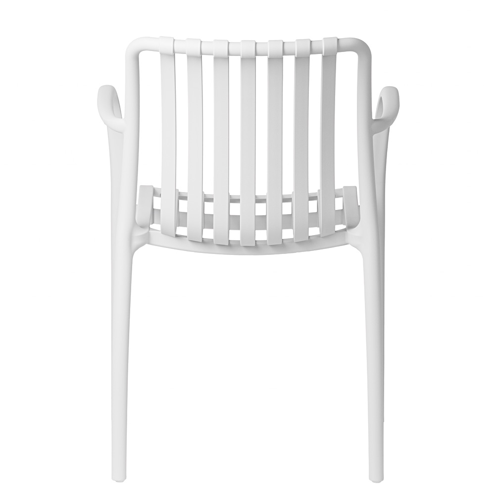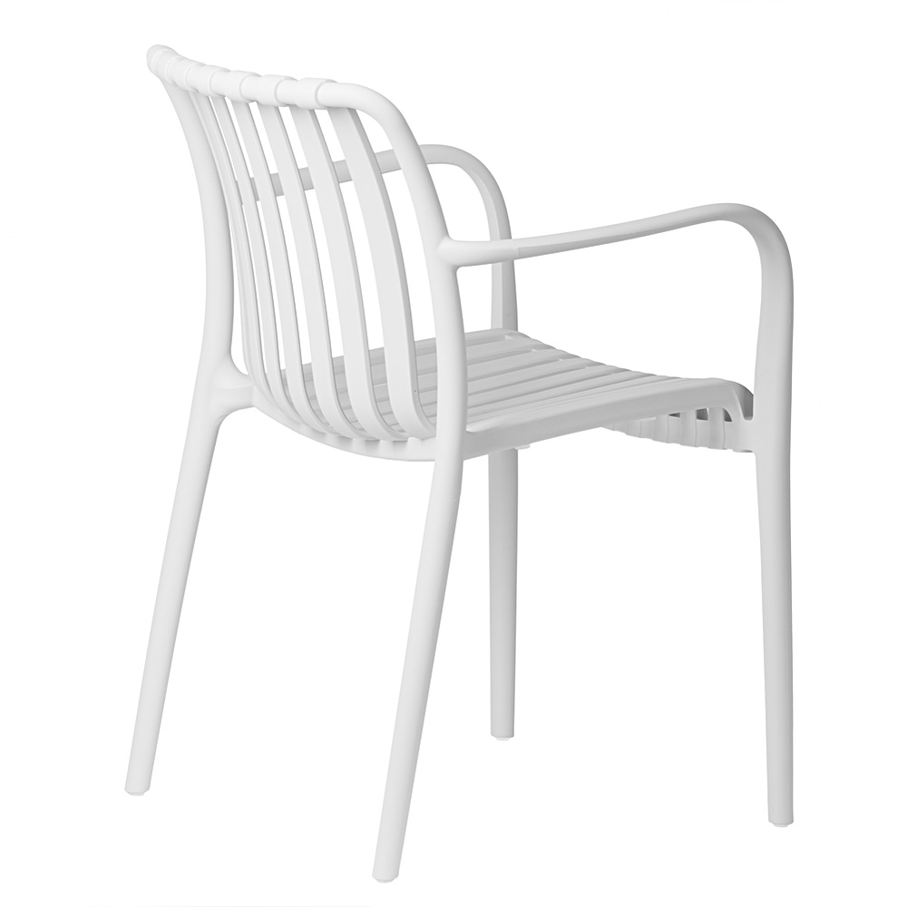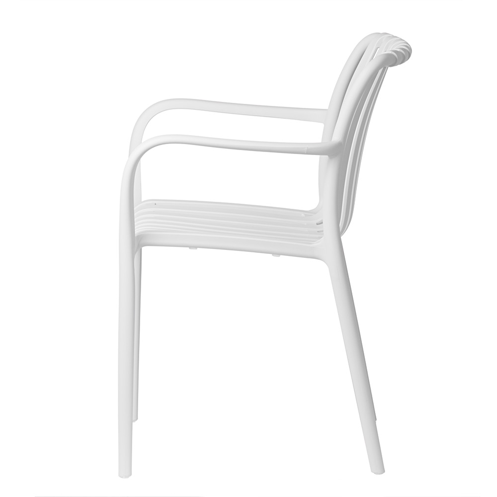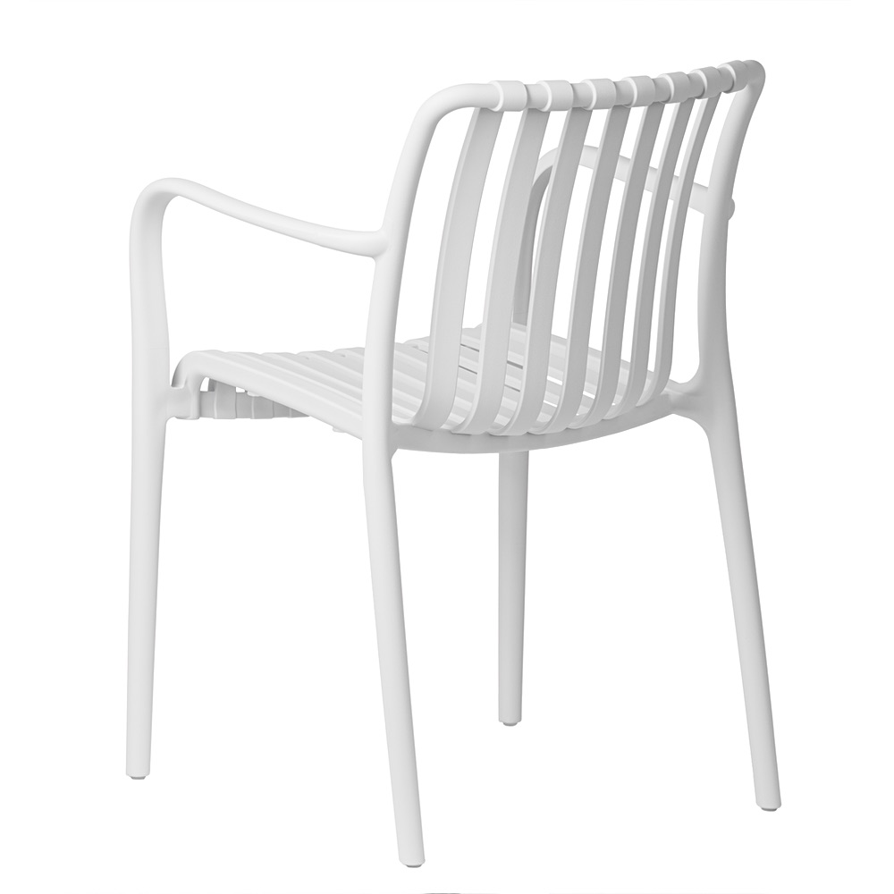 Krzesło Aura w kolorze białym to nowoczesne krzesło ogrodowe z podłokietnikami, które wyróżnia się prostą formą i uniwersalnym charakterem. Jasna, neutralna kolorystyka optycznie rozjaśnia przestrzeń i sprawia, że mebel doskonale prezentuje się na tarasie, balkonie oraz w ogrodzie. Smukłe, pionowe listwy oparcia nadają konstrukcji lekkości wizualnej, a spójna linia podłokietników podkreśla minimalistyczny design